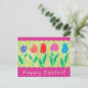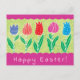 This postcard for Easter features a row of pretty pink, orange, and aqua tulips on a whimsical pale green background.