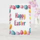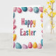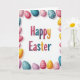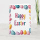 This card features the words “Happy Easter” centered in large, rounded letters, each one in a different bright shade like pink, purple, yellow, and teal, set against a white background. Around the text, a loose frame of decorated egg shapes creates a cozy, gathered-around-you feel, like friends circling in for a group photo 🌷. The eggs are shaded to look slightly raised, with soft pastel tones of pink, lavender, sky blue, and buttery yellow. Each egg has its own pattern—tiny dots, wavy lines, zigzags, and stripes—adding variety without looking busy. The lighting is even and gentle, giving the eggs a smooth shine and rounded edges that feel sweet and inviting 🐰. The greeting sits clearly in the middle, while the border stays near the edges, leaving plenty of white space so the colors stand out. Several eggs tilt at different angles, with alternating patterns and pastel colors forming an irregular ring around the centered “Happy Easter” text.