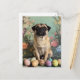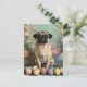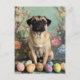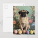 Cute pug Easter botanicals postcard. Rustic style picture of a fawn pug dog with Easter eggs and floral botanicals.