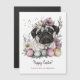 Cute pug Easter botanicals postcard. Rustic watercolors and lineart style pastel color pug with Easter eggs and floral botanicals. Personalized text with a lovely trendy script.