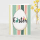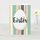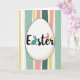 This card features a large white oval like a decorated egg, sprinkled with light beige speckles and edged with a thin black outline. Across the center, the word “Easter” appears in flowing black lettering, set prominently on the oval. A teal bunny silhouette takes the place of the “s,” leaning toward the next letter as if sharing a gentle, friendly nuzzle 🐰. A coral-pink bunny forms the “t,” standing close in a way that suggests a sweet connection between the two figures 🐇. A tiny yellow chick becomes the dot over the “i,” adding a small, cheerful accent near the middle of the word. Behind the oval, the background is filled with vertical pastel stripes in mixed widths, including mint green, deeper green, creamy off-white, soft buttery yellow, and rose pink. The stripes run straight from top to bottom, framing the central oval with calm, springlike color bands.