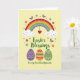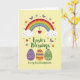 This card shows a softly shaded pale yellow background with a rainbow-like arc stretching across the upper area between two light, fluffy clouds 🌷. A small red heart hangs from the top of the arc, like a gentle token being offered to someone special. Just beneath, the words “Easter Blessings” sit centered in medium-to-dark green lettering that feels friendly and springlike. Lower on the card, three decorated egg shapes are lined up side by side, suggesting a shared moment of celebration. The left egg is deep purple with small white dots, the middle egg is orange with wavy blue and red lines, and the right egg is green with white floral patterns 🐰. Tiny flowers in blue, orange, and green, along with a few small winged insects, are scattered around as if they’re drifting between the eggs and the clouds. Along the bottom edge, a smaller line of text reads “For my dear Grandparents” in a darker tone, with the rainbow and dangling heart hovering above.