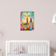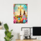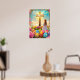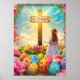 He is risen. Holy Easter Poster with a cross, vibrant easter eggs and floral art. Holy Jesus Christ religious christianity art.