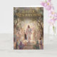 Celebrate the gentle triumph of Easter with this serene card featuring a pastel painting of Jesus standing just outside the open tomb, arms raised in quiet victory as soft glory glows behind Him. Awestruck people gather near, their faces bathed in hues of dawn pink, lavender, and pale gold, capturing the tender miracle of resurrection hope. Inside, graceful poetry traces the mystery of life rising from silence, calling every heart to lift up in joy and wonder at the Lamb who makes all things new.