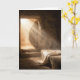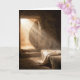 Sunlight pours into a stone tomb, illuminating a folded white cloth on a rocky surface while the entrance, framed by large stones, creates a calm contrast between light and shadow.