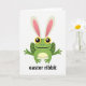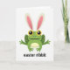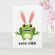 This card features a cheerful green frog centered on a bright white background, giving its fresh chartreuse and deeper forest tones plenty of room to stand out. Its large round eyes, rimmed with yellow and dotted with dark pupils, lean into a friendly, inviting look, and the gentle smile feels like it’s meant for someone you care about. Two long bunny-like ears rise from the top of its head in pale cream with soft pink interiors, adding a sweet spring twist 🐰. Dark green speckles scatter across its back and limbs, adding a light touch of texture while keeping the design simple and airy. Below the character, the phrase “easter ribbit” appears in lowercase, set in thick black lettering that’s easy to read. The words sit centered under the frog, leaving generous white space that makes the message feel direct and close, like a small private note between friends 🌷. The frog’s ears angle slightly outward, with the pink inner sections clearly visible against the cream outer edges.