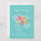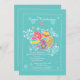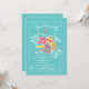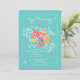 A lovely teal invitation with beautifully colored Easter eggs and fanciful flowers and foliage bordered with a dotted frame.