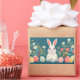 Cute white rabbit with a flower background and easter eggs on both sides of the rabbit