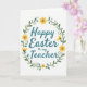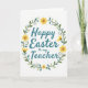This design shows a white background framed by a circular wreath of leafy stems and spring flowers 🌷. In the center, the main line of text reads “Happy Easter” in teal lettering, with “to my Teacher” placed just below it in a smaller matching teal style. The wreath wraps around the words like a gentle hug, giving the layout a friendly, appreciative feel. Along the ring, deep and light green leaves alternate in layered clusters, with curling stems that guide your eye around the circle. Bright yellow flowers are scattered throughout, some shaped like open daisy-style blooms with warm brown centers and others with slimmer, lily-like petals. The soft contrast between teal lettering and fresh greens makes the message easy to spot, while the sunny flowers add a warm, caring tone 🐰. Yellow blossoms and green leaves form an even circle around the centered teal text, leaving plenty of white space beyond the wreath.