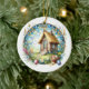 A beautiful stained glass Easter ornament of a a tiny log church surrounded by flowers and Easter eggs