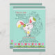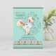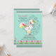 A cute Easter bunny is on the move in this adorable, seasonal invitation. The teal background features a floral Easter egg and a border of red and pink tulips. (FP)