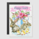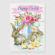 Enjoy sending this beautiful, watercolor Easter greeting to your family and friends, so that they can enjoy it for a long time. Two watercolor gray rabbits and four yellow chicks in front of a watering can filled with pink and purple spring flowers. A pink banner at top with "Happy Easter".