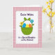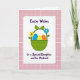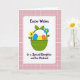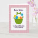This card shows a white rectangular greeting card centered on a pastel pink tiled background with thin white grout lines. In the middle sits an emerald-green basket with soft wavy texture marks, its arched handle topped with a neat green bow that feels like a small gift between close family members 🐰. Inside the basket are three smooth eggs in cerulean blue, daffodil yellow, and tangerine orange, arranged closely as if nestled together in a caring embrace. Two simple flowers peek up from behind the basket—one yellow with a deep violet center and one bright blue with a golden center—adding a gentle, friendly closeness to the scene 🌷. The main text, “Easter Wishes,” is placed above the illustration in flowing dark purple lettering. A second line of text sits below the basket in the same dark purple, reading “to a Special Daughter and her Husband,” centered and evenly spaced. The basket and eggs are framed by the upward-reaching stems and the soft pink tile pattern behind them. The background shows pastel pink square tiles in a tidy grid with white grout outlining each square.