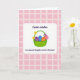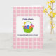 Designed with a white panel with rounded corners centered on a pale rose background patterned with a neat grid of slightly deeper pink squares. In the middle sits a green basket with an arched handle, decorated with small blossoms in yellow, purple, and fuchsia, like a sweet gift shared between loved ones 🌷. Tucked inside are three egg-shaped forms, each striped in deep violet, bright blue, and warm orange, arranged close together as if keeping each other company 🐰. Near the top of the white panel, the words “Easter wishes” appear in a flowing plum-colored style. Below the basket, a smaller line of text reads “to a Special Daughter and her Husband,” also in a matching purple tone and centered. The soft pink setting and tidy layout give the scene a gentle, affectionate closeness, like a quiet note exchanged between family. The basket’s handle arches over the eggs, with the blossoms clustered along it in bright yellow, purple, and fuchsia.