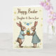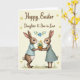 On the front of the card two long-eared animal characters stand close together, their gentle smiles and rosy cheeks hinting at affection as they share a small terracotta pot of sunny yellow flowers 🌷. The left character wears a light blue and white striped tunic and leans in with an easy, caring posture toward the companion. The right character is dressed in a sky-blue dress with yellow polka dots, holding the pot with both hands as if offering it with quiet tenderness 🐰. Soft light and smooth shading give the figures a velvety look, while the cream background is sprinkled with small golden hearts that echo their warm connection. Near the top, the message “Happy Easter Daughter & Son in Law” appears in medium-blue lettering, centered and easy to read against the pale backdrop. A small cluster of blue blossoms and green leaves sits above the pair, tying in with a few short green tufts along the bottom edge. The terracotta pot sits between them, with rounded yellow blooms and tiny green stems fanning upward.