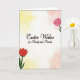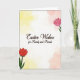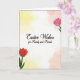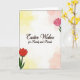 This card features a white background with the phrase “Easter Wishes for Family and Friends” placed at the center in flowing dark brown lettering. Soft watercolor-like washes tint the corners, with pale yellow drifting along the left side and a peachy pink haze on the right, like light passing through spring petals 🌷. A red, cup-shaped flower grows up from the bottom left on a slim green stem, leaning inward as if reaching toward the message. From the top right, a bright pink blossom angles down toward the center, creating a gentle, friendly back-and-forth between the two blooms 🐰. The open space around the words keeps the layout airy, while the floral corners frame the greeting without crowding it. The text remains the darkest element on the page, so it stands out clearly against the soft color clouds. A faint, lightly textured border sits near the edges, giving the card face a subtle paper-like finish.