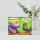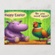 Experience the joy of Easter with this delightful illustration. A friendly purple hippo extends warm greetings, while a vibrant pheasant perched on a rock asks if you need eggs. The bright green background with bamboo designs adds a natural and playful feel. Speech bubbles clearly convey the characters' messages, making the scene engaging. The cartoonish style and vivid colors create a cheerful atmosphere. This image is perfect for spreading Easter cheer and bringing a smile to viewers.