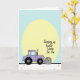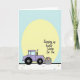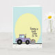 This card shows a soft pastel scene with a lavender utility vehicle centered on a pale blue background, its black tires and front loader drawn with simple, steady lines. The vehicle sits on a thin black horizon line, and below it a sprinkle of tiny multicolored dots looks like confetti or fallen petals 🌷. Above, a large buttery-yellow circle fills much of the top half like a sun or moon, casting a gentle glow that makes the scene feel quietly affectionate, like a small gesture meant for someone close. Inside that yellow circle, the greeting “Scooping up Easter Wishes for You” appears near the top in a dark, hand-lettered style that stands out clearly. The loader lifts a gray bucket tipped slightly forward, as if offering its contents to a friend with an easy, caring grin 🐰. In the bucket, pastel egg-shaped treats in pink, mint, blue, and yellow pile up in a cheerful mix, each outlined so the shapes read clearly. The overall layout keeps the vehicle low and centered, with the yellow circle overhead and the dotted accents scattered beneath the horizon line. The bucket brims with oval shapes in several pastel shades, nestled against the gray rim.