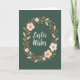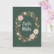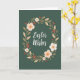 This greeting card features a deep, muted forest-green background that makes the center artwork feel calm and intimate. A circular wreath sits in the middle, arranged like a gentle embrace, with flowers and leaves curving toward each other as if in a quiet, friendly hug 🌷. Five-petaled blooms appear in pale peach with warm orange centers alongside crisp white flowers with matching bright hearts, creating soft contrast against the dark field. Olive-green leaves mix with warm golden-beige foliage, layered to give the ring a tender, gathered look. Small clusters of red berries dot the wreath, adding little sparks of color that feel like shared glances between close companions 🐇. In the open space at the center, the words “Easter Wishes” are placed prominently in flowing white lettering, clearly legible against the green. The wreath is evenly balanced around the text, with berries and blossoms spaced so the circle feels full but not crowded. The outer edge of the wreath shows alternating leaf shapes and scattered red berry clusters against the dark green background.