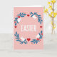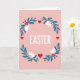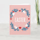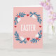 This card features a soft blush-pink background that sets a gentle, springtime mood. Centered on the front, the word “EASTER” appears in crisp white, simple lettering that stands out clearly. Encircling the text is a round wreath of slender branches and deep teal-blue leaves, arranged like an embracing ring. Tucked among the leaves are small blossoms in white and deep red, adding sweet touches that feel like a shared bouquet between close friends 🌷. Four small white bunny shapes 🐰 are nestled into the greenery, as if quietly leaning in toward the center message. Bright red hearts are scattered through the wreath, suggesting affection through their placement near the bunnies and flowers. The design stays flat and graphic with smooth edges, using only pink, teal, white, and red to keep the look focused. The hearts and blossoms alternate around the circle, with the teal leaves forming the main border around the white “EASTER” text.