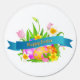Celebrate Easter with a cute Happy Easter Yard sign. Outdoor indoor capability. Has a Happy Easter greeting on a Turquoise Blue banner with flowers and dyed Easter Eggs print. Double sided.