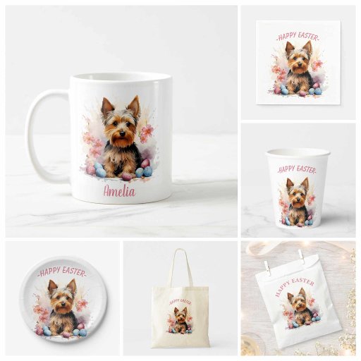 Return address labels featuring a watercolor Yorkshire with flowers and Easter chocolate eggs. Customizable.