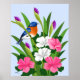 An Eastern Bluebird perched on an Iris stem with Mallow flowers in the foreground