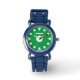 Easy to tell time kid's watch with custom name. Personalized wrist watches printed with name or monogram letters. Cute Birthday gift idea for boys and girls. Sporty design with numbered bezel. Chirldren's presents with simple dial design for easy learning. Perfect for son, grandson, nephew, grandchild, friend etc. Green or custom color background. Black leather strap.
