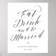 Simple Elegant Calligraphy Script Wedding Reception Eat Drink and be Married Sign in beautiful flowing fancy letters and your personalized names, location, and date. A stylish yet simple formal design in black and white or any background color you choose. Just click the customize further link, shown under the text personalization area on the right, and choose your custom color background. This sign poster template makes it fast and easy to create stunning additions to your wedding decor. Signs can be enlarged, there are many sizes to choose from, as well as options for custom framing and matting. Welcome to our wedding custom signage.