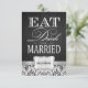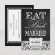 Elegant Eat Drink and be Married Wedding RSVP card with black and white damask and silver accents.