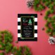 Eat, drink and be merry Christmas birthday party invitation featuring a Christmas tree and gifts against a gold frame. Black and white striped background with holly