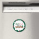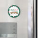 "Eat, drink and be merry" slogan with gingerbread heart shaped cookies and holly decoration on Christmas fridge magnet.