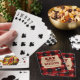 These custom playing cards feature a festive Christmas theme. The background features a rustic red Buffalo plaid pattern sprinkled with snowflakes. A vintage parchment paper style poster is printed in the center and framed with a gold foil style border. The phrase "Eat Drink and Be Merry" is printed at the top in a burgundy red font, followed by a sample family name. You can personalize the cards to include your own custom name or other text.