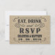 Eat, Drink, and be Married -- Vintage style rustic country western wedding invitation RSVP Response Cards with rounded corners optional. -- Swirly, curly scrolls and old-fashion cowboy style typography in black in old west style grungy playbill poster style on natural tan burlap background. Add the bride and groom names and wedding details in this easy to use template. Elegant but fun and romantic, retro hand-written style can be can be easily modified for your formal or semi-formal wedding themes. Casual modern country style is perfect for trendy rustic weddings with a fun touch of sophisticated charm for traditional couples. Please contact us for help with customization if you need additional room for your wedding details. Other sizes and styles available, along coordinating postage, bridal accessories, shower favors, and wedding packet essentials for diy brides on a budget. Note: This is a paper card with a PRINTED image for decorative effect. There are no real or raised textures.