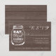 Wood grain panel rustic country chic mason RSVP wedding cards. Part of a theme set with quote. Eat drink and be married. Give your guests a way to respond if they are coming to your elegant wedding in summer, spring or fall. This vintage design goes together with similar wedding reception invitations. Customizable text and paper quality. Chic Script typography. Beautiful DIY style graphics. Brown and white barn / outdoor bbq wedding set.