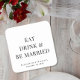 Modern paper coaster party decor and favor for your wedding reception, rehearsal dinner, engagement party, and other wedding events featuring "Eat Drink & Be Married," your first names and your wedding date in elegant serif typography.