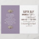 A beautiful, fun and inexpensive option for wedding programs. These will be shipped to you flat and you will need to fold them in 1/2 or most local print shops will do this for you at a nominal charge. Elegant and fun fonts announce the message, "Let's eat, drink and get married!" on a delightful whimsical Wedding Invitation Ensemble. In a clean, crisp, lavender, chocolate brown and white color palette it's the best of vintage with a modern twist. The wedding program has the text and your names with your wedding date as well as your favorite quotation, scripture or? on the back side. The interior is set up for you to customize. If you need assistance on this there is a small charge for the service, just email us. There is a complete suite of products available with this design and we can do it in any color combination(s) you desire.