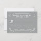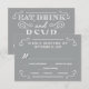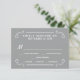 Eat, Drink, and be Married -- Vintage style rustic country wedding invitation personalized RSVP Response Cards -- Swirly, curly scrolls and old-fashion woodcut typography in radiant white on dove gray background. Add the bride and groom names and wedding and reply dates in this easy to use template. Elegant but fun and whimsical, retro hand-written style can be can be easily modified for your formal or semi-formal wedding themes. Casual modern country style is perfect for trendy rustic weddings with a fun touch of sophisticated charm for traditional couples. Please contact us for help with customization if you need additional room for your wedding details. Other sizes and styles available, along with matching invitations, postage stamps, coordinating accessories and shower favors.