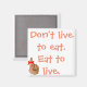 REFRIGERATOR MAGNET TO HELP EAT LESS AND MAINTAIN THE WEIGHT. IT READS: DON'T EAT TO LIVE, LIVE TO EAT". A LITTLE HELP THAT CAN GO A LONG WAY WHEN YOU WANT TO CHANGE YOUR EATING HABITS.