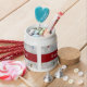 White Porcelain candy jar with an image, on both sides, of white golf balls and red, yellow, blue and green tees. Optional red ribbon and text. See matching espresso cup, flask, mug, pitcher, paper plate, shot glass, teapot and coasters. See the entire Father’s Day Candy Jar collection in the FOOD/BEV | Dishes section.