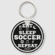 For anyone whose schedule really is soccer all the time, this keychain says it plainly with the text “EAT SLEEP SOCCER REPEAT” in bold block letters. The black-and-white badge design mixes a moon, clocks, soccer ball, repeat arrows, and a player silhouette for a clean sporty look. It works especially well for players, soccer moms, soccer dads, and coaches who want a small accessory that feels personal on keys, backpacks, or practice bags.