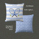 This blue and white patterned pillow has a smart design featuring crossed tennis rackets in blue. It is ready for you to personalize with your child's name. The accompanying caption is simply "Eat, sleep, tennis" or you can customize this too. On the back is a repeating geometric pattern of blue tennis rackets on a light blue background to match the front.