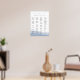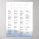 Wedding guest seating chart in dark gray and white with coastal watercolor detailing along the bottom features "please find your seat" at the top in elegant calligraphy script lettering, with your guest table assignments beneath, arranged alphabetically across four rows. Accommodates up to ~100 guests; use the design tool to reduce font size if more space is needed.