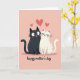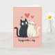 This design shows two cartoon-style cats cuddled close, with a sleek black one leaning in beside a creamy white one, creating a cozy, affectionate moment ❤️. The black cat has big, shiny eyes and a small open smile, as if it’s mid-giggle while staying tucked against its companion. The white cat has faint light-brown stripes, closed eyes, and a gentle blush on its cheeks, giving the scene a calm, cared-for look. Above their heads, three red hearts float in a loose cluster, like quiet signals of closeness. The background is a soft pastel pink that keeps everything feeling warm and intimate without distracting from the pair. Along the bottom, a short message sits centered in flowing black lettering, standing out clearly against the pale backdrop 🌼. The cats’ bodies overlap slightly, with their faces turned toward each other in a tender, friendly pose. The black cat’s tail curves along the lower edge near the text, while the hearts hover just above their ears.