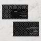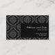 A black and grey damask pattern serves as a wallpaper for this card while a rich black panel holds your business information. The pattern is repeated on the back in a darker shade to show off your address, phone and web information. Available in alternate colors.
