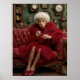 Step into a world of timeless charm and quirky sophistication with this richly detailed portrait of an elderly woman dressed in extravagant crimson. Seated regally on an ornate vintage sofa, she exudes poise and mystery, her expression both commanding and contemplative. Her voluminous red feathered coat, perfectly coordinated lipstick, and shoes are matched by her neatly styled white curls and the deep vintage tones of the room around her. The lush textures and antique decor—clocks, lanterns, and framed curiosities—create a gothic yet whimsical ambiance. This image captures the beauty of aging with flair and eccentric grace, offering a visual narrative of character, history, and unapologetic style. Ideal for those who love vintage aesthetics, maximalist fashion, and characters full of stories. Perfect for prints, greeting cards, or quirky home decor.