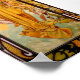 Wonderful Art Nouveau color lithograph by Czech artist Alphonse Mucha from his 1899 series "Les Heures du Jour" (The Hours of the Day), entitled "Éclat du jour" (Light of Day). A beautiful, ethereal woman with red hair wearing an off-the-shoulder, flowing yellow dress, surrounded by yellow flowers, a blue sky with fluffy white clouds in the background.