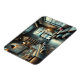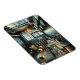 The painting captures a moody and stylish scene inside a small, eclectic, hip café in Seattle. The café's interior combines urban and rustic elements, featuring exposed brick walls alongside modern metallic fixtures. The color scheme is dominated by dark grays with vibrant neon accents, creating a trendy, youthful ambiance. The furniture is an intriguing mix of vintage plush sofas and minimalist bar stools, adding to the eclectic charm. A prominent glass door opens to the busy street outside, linking the café's intimate interior with the city's dynamic life. Artistic details such as abstract paintings and industrial-style lamps contribute to the hip atmosphere, while unique, geometric-shaped lights cast soft, ambient lighting, creating intriguing shadows and enhancing the overall moody and fashionable vibe of the café.