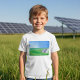 Inspire the next generation of eco-warriors with this vibrant solar energy boys t-shirt. The design features a colorful illustration of modern solar panels set against a backdrop of rolling green hills and a bright sunburst sky. Perfect for school, science camp, or everyday play, this comfortable tee celebrates clean technology and a sustainable future. It is an ideal gift for young explorers and future engineers who are curious about the power of the sun and protecting our planet.