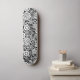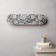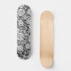 A skateboard with interesting and diverse abstract design consisting of various circular shapes in different styles connected by thin lines like a network or ecosystem.